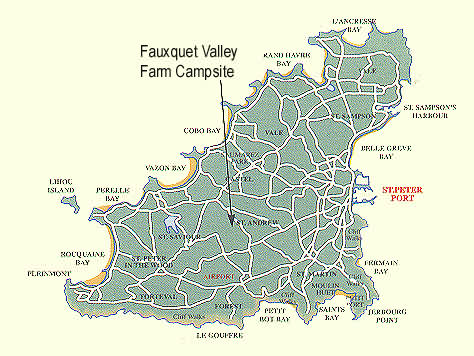 Directions from the ferry to the campsite:Proceed to the end of the pier and take the second exit at the roundabout. Continue to the top of the hill to a FILTER- IN- TURN system and turn left into ' QUEEN'S ROAD'. Traveling through another filter in turn system turn right and onto a set of traffic lights. Straight over the lights and on down the hill passed the ' PRINCESS ELIZABETH HOSPITAL' on the left, through pedestrian lights and onto the top of the hill straight through another set of lights. Continue for about one mile, then look for a sign for 'GERMAN UNDERGROUND HOSPITAL', turn right at the sign along Candie Road and past the fourth turning on the left look for the campsite sign. GOOD LUCK!